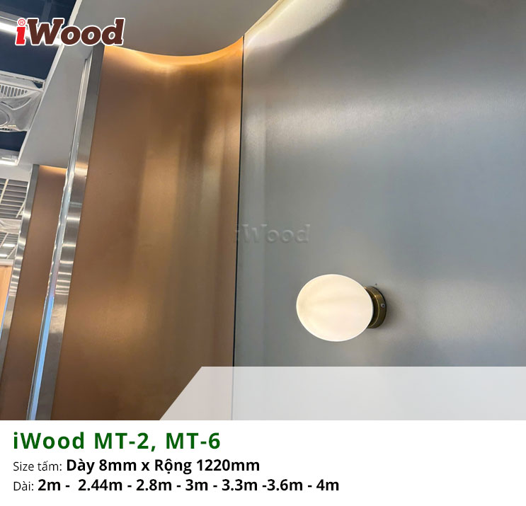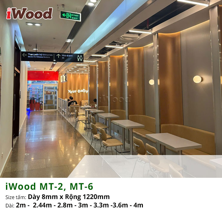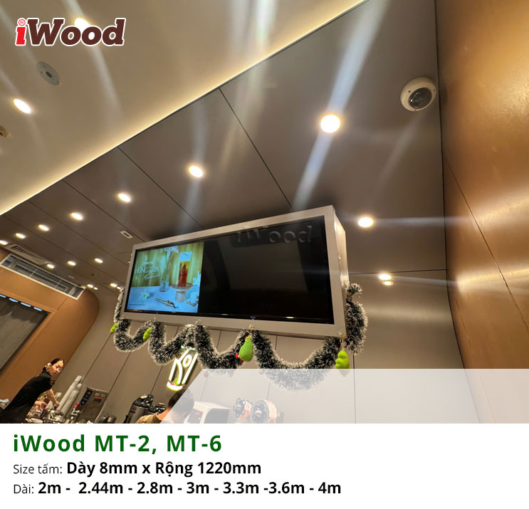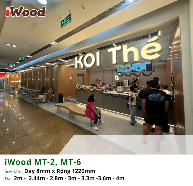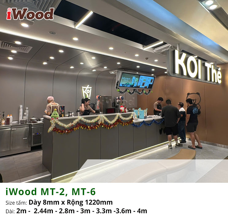 Tấm ốp đa năng than tre inox xước iWood MT-2, MT-6 là lựa chọn lý tưởng để tạo điểm nhấn hiện đại và khác biệt cho không gian quán trà sữa Koi Thé. Với bề mặt inox xước sang trọng, sắc nét, hai mã màu MT-2 và MT-6 giúp tôn lên phong cách trẻ trung nhưng vẫn giữ được sự tinh tế đặc trưng của thương hiệu. Cốt than tre bền chắc mang lại khả năng chống ẩm, chống cong vênh và giữ màu ổn định, phù hợp với môi trường kinh doanh đông khách. Việc ốp trang trí bằng iWood không chỉ tăng tính thẩm mỹ mà còn giúp không gian trở nên sạch sẽ, dễ vệ sinh và thu hút hơn, tạo trải nghiệm thoải mái cho khách hàng khi thưởng thức trà sữa.