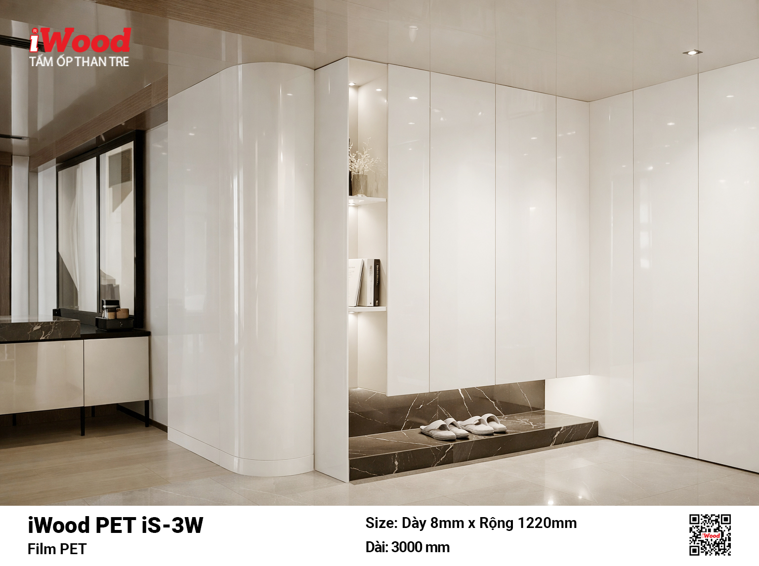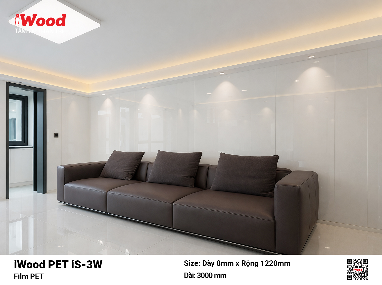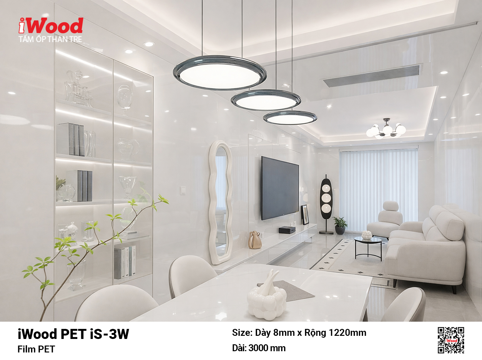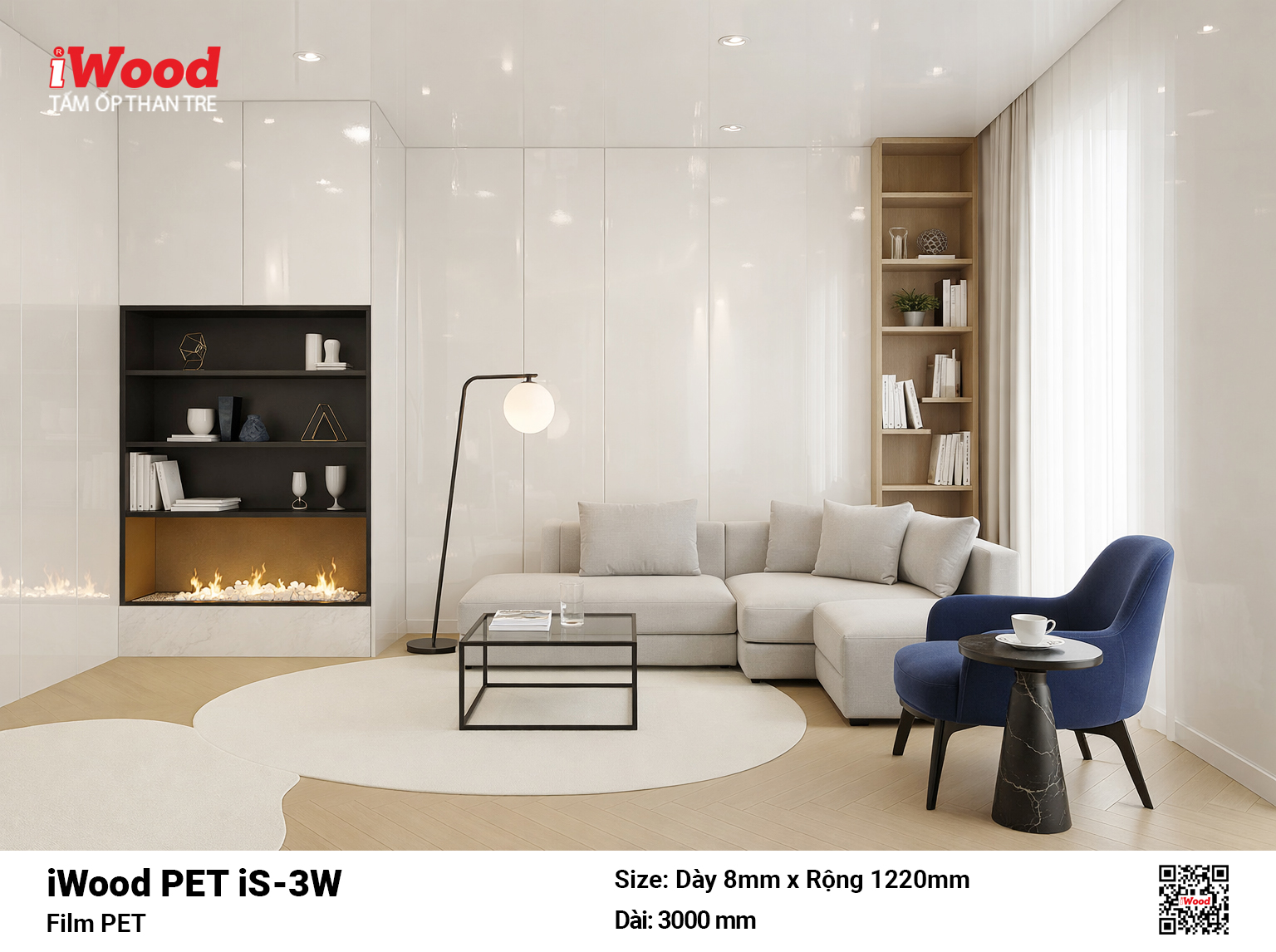 Phối Cảnh_Tấm ốp than tre film PET iS-3W, Tấm Than Tre Film PET Phối Cảnh 3DTấm Ốp Than Tre Film PET iS-3W Tấm Than Tre Film PET iS-3W màu trắng ngà mang sắc kem sữa thanh lịch, bề mặt film PET bóng mịn giúp không gian sáng hơn và hiện đại hơn. Phù hợp ốp tường, vách tivi, phòng khách, showroom – dễ phối cùng lam sóng và sàn gỗ, bền đẹp và dễ vệ sinh.