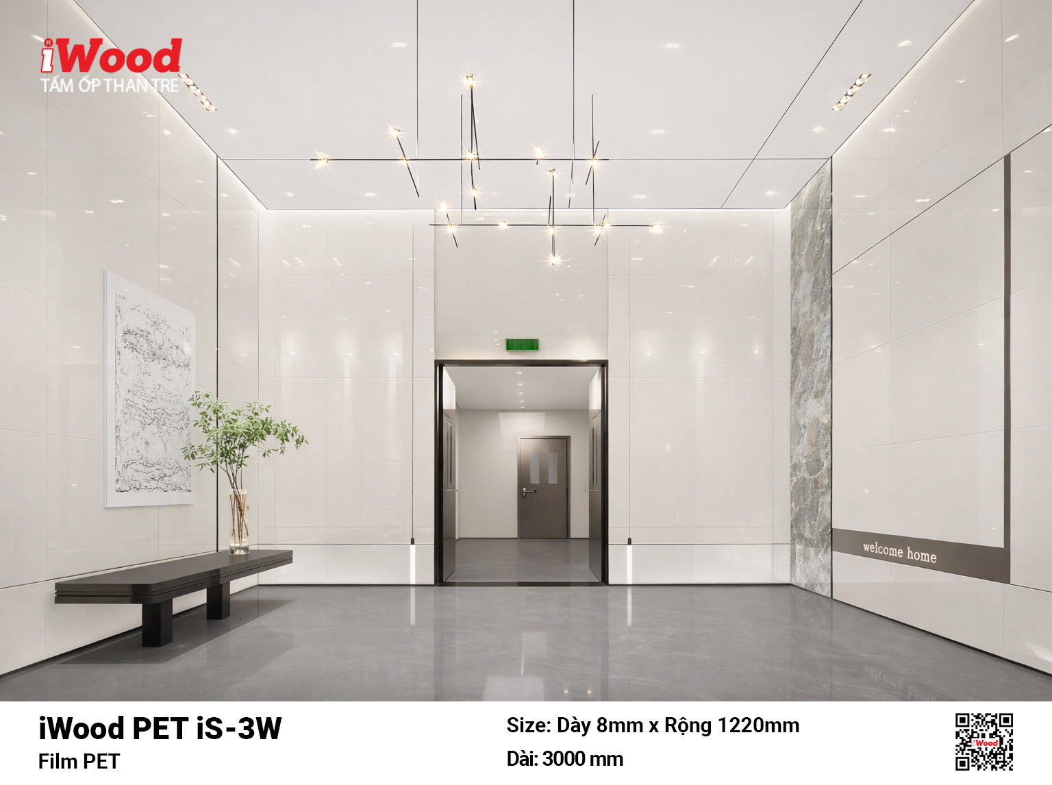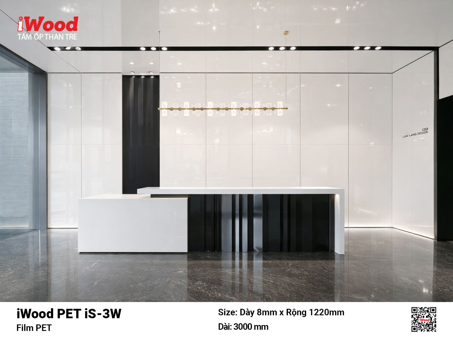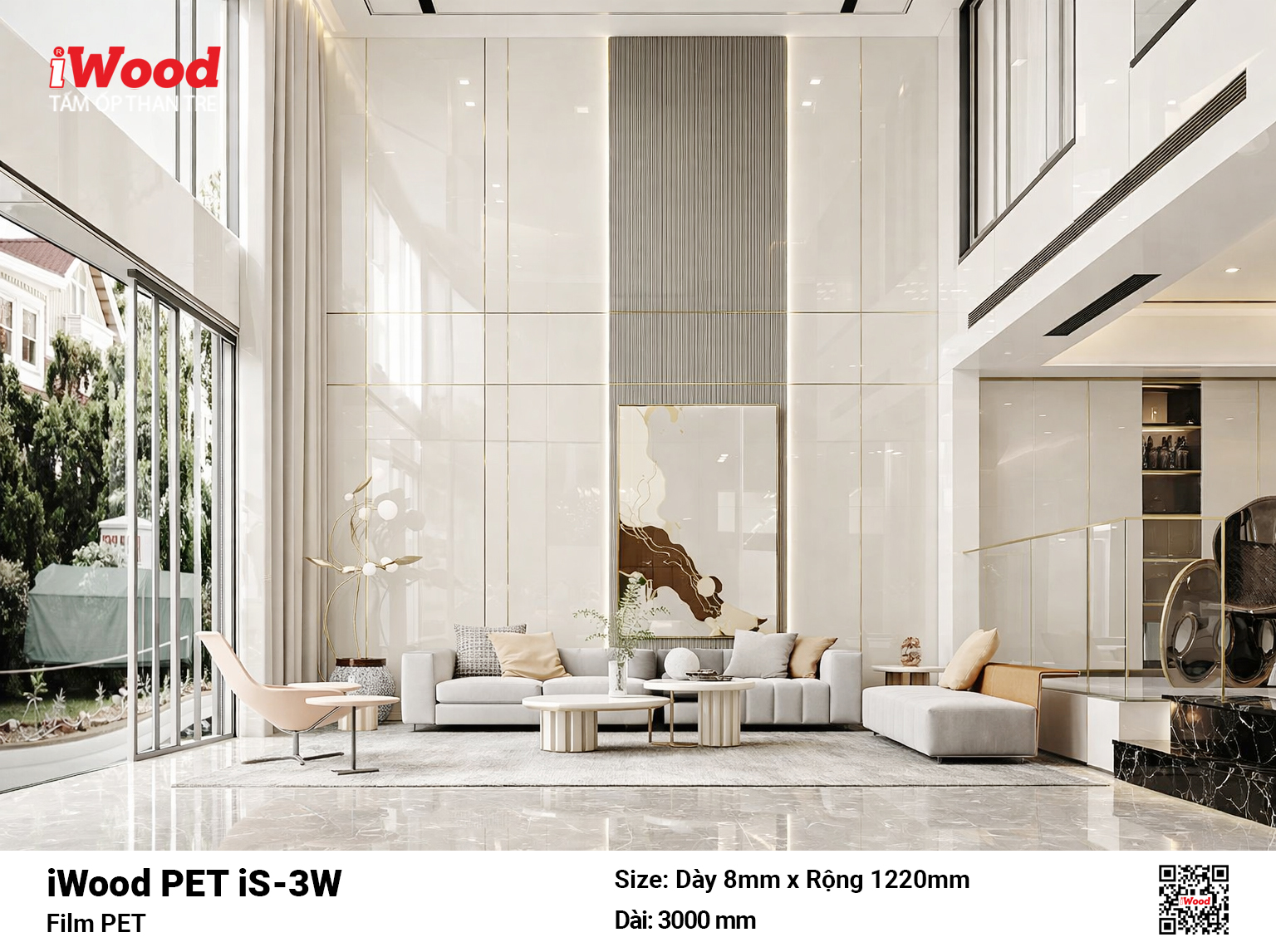 Phối Cảnh_Tấm ốp than tre film PET iS-3W, Tấm Than Tre Film PET Phối Cảnh 3DTấm Ốp Than Tre Film PET iS-3W Tấm Than Tre Film PET iS-3W màu trắng ngà mang sắc kem sữa thanh lịch, bề mặt film PET bóng mịn giúp không gian sáng hơn và hiện đại hơn. Phù hợp ốp tường, vách tivi, phòng khách, showroom – dễ phối cùng lam sóng và sàn gỗ, bền đẹp và dễ vệ sinh.