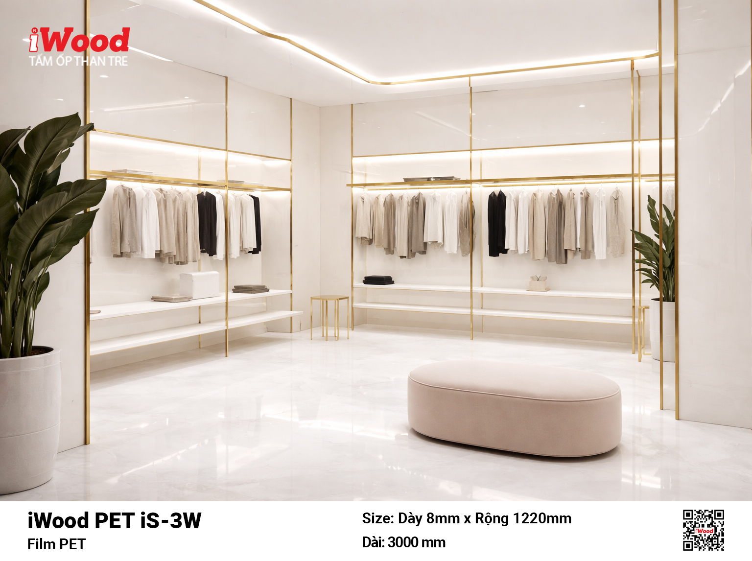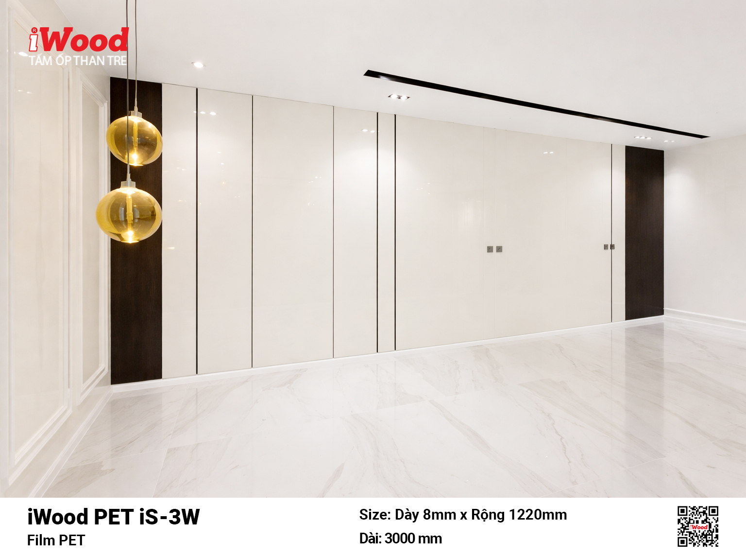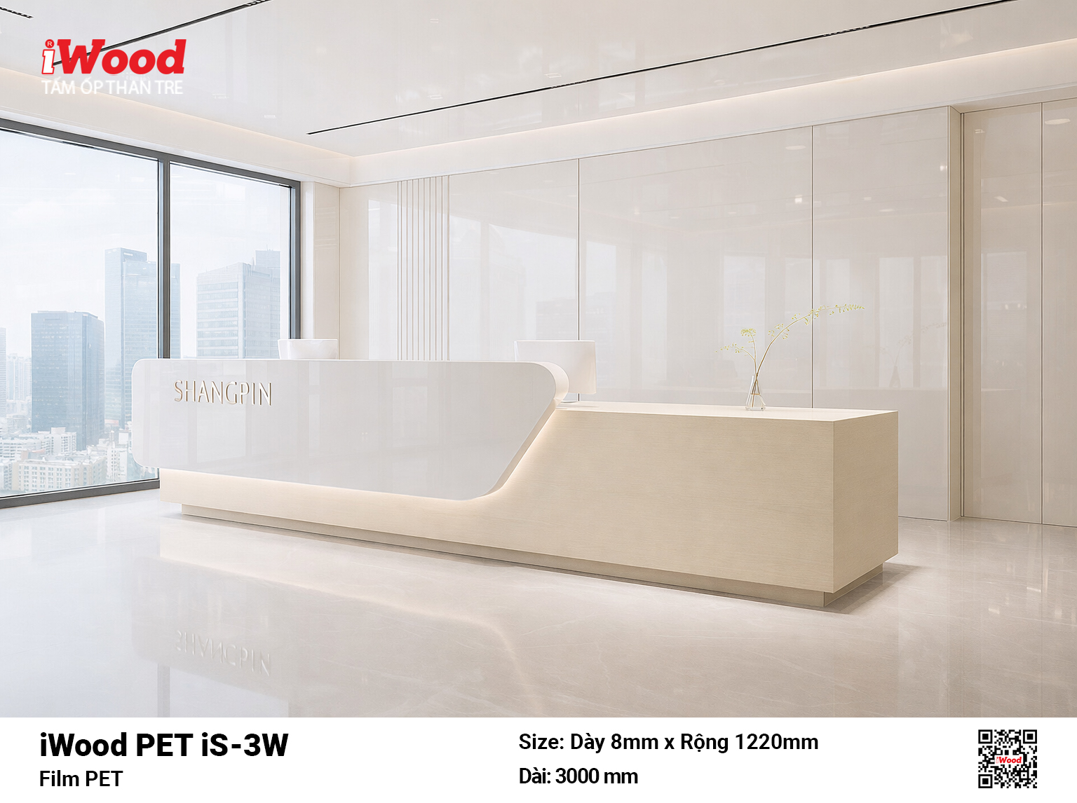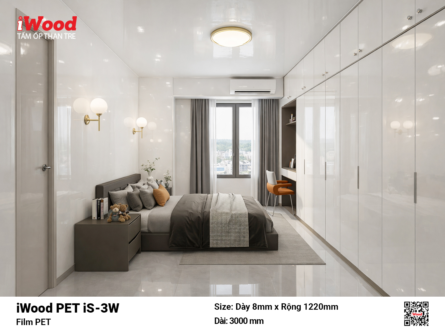 Phối Cảnh_Tấm ốp than tre film PET iS-3W, Tấm Than Tre Film PET Phối Cảnh 3DTấm Ốp Than Tre Film PET iS-3W Tấm Than Tre Film PET iS-3W màu trắng ngà mang sắc kem sữa thanh lịch, bề mặt film PET bóng mịn giúp không gian sáng hơn và hiện đại hơn. Phù hợp ốp tường, vách tivi, phòng khách, showroom – dễ phối cùng lam sóng và sàn gỗ, bền đẹp và dễ vệ sinh.