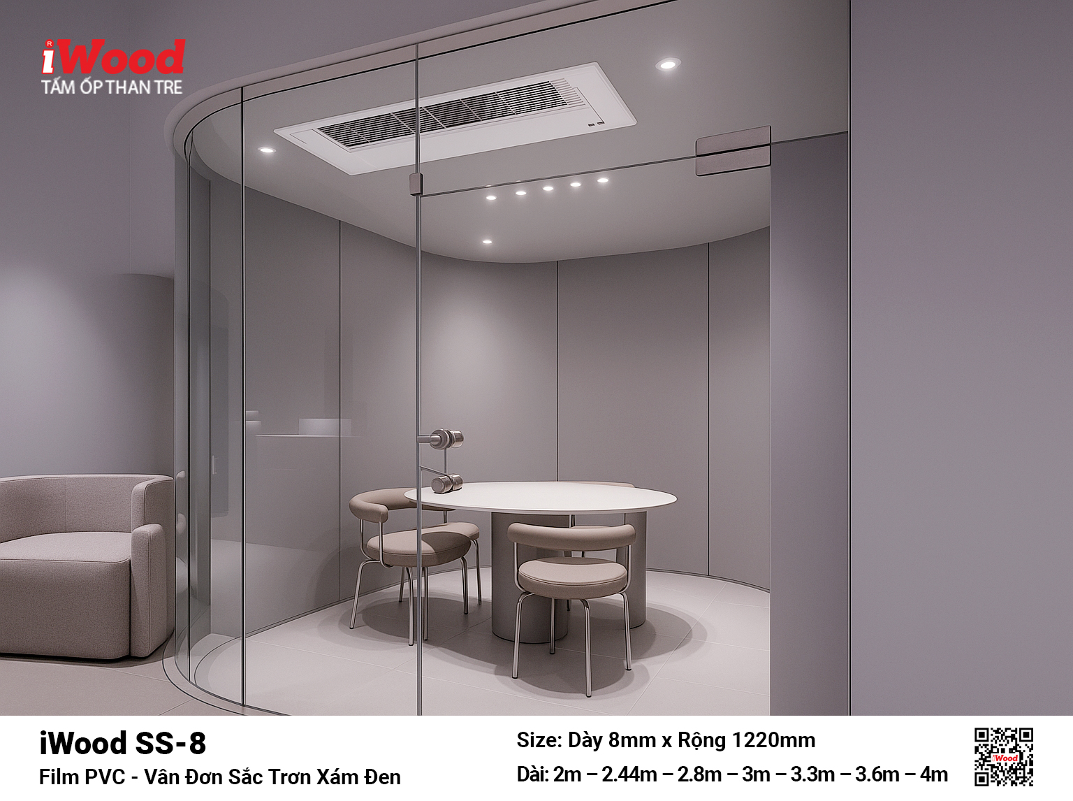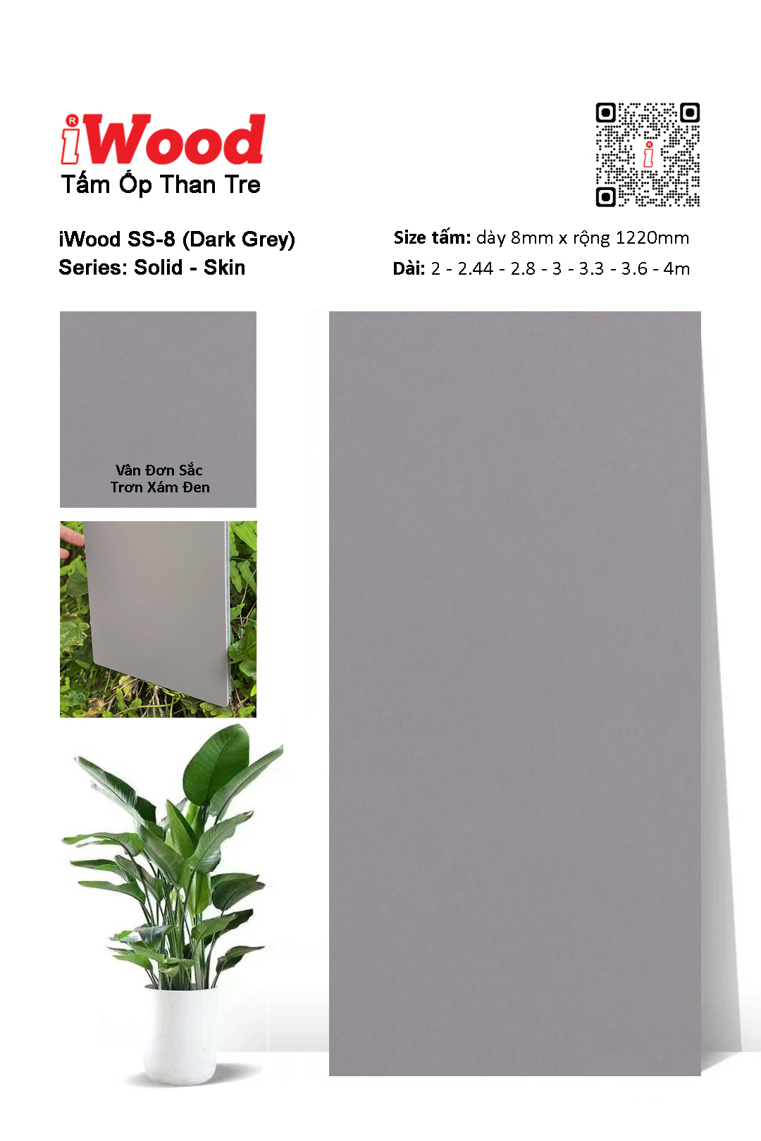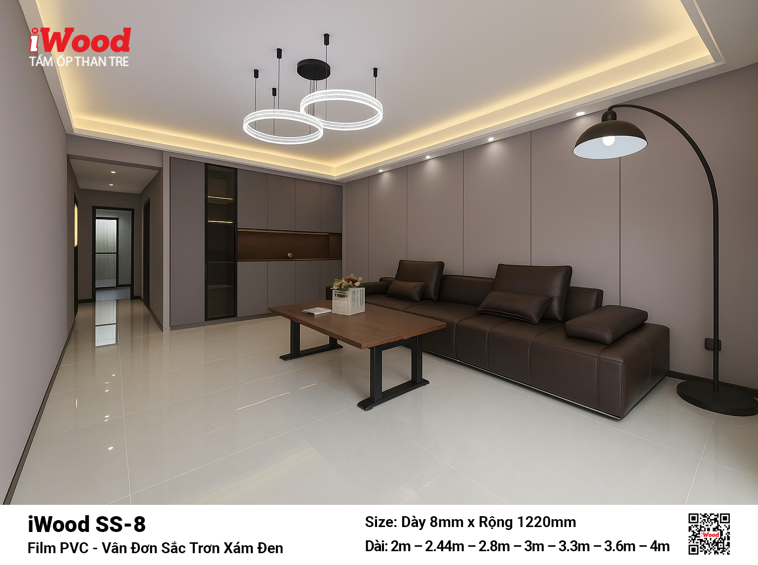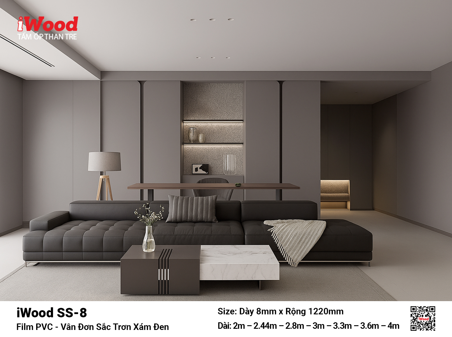 Tấm Than Tre Đơn Sắc Phối Cảnh 3DTấm Than Tre Film Đơn Sắc SS-8 Tấm Than Tre Film Đơn Sắc SS-8 – Màu xám tinh tế, sang trọng, hoàn hảo cho vách tường nội thất hiện đại. Chống trầy, dễ vệ sinh, mang đến không gian ấm cúng và thanh lịch.