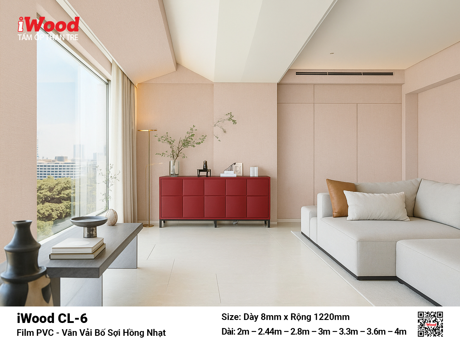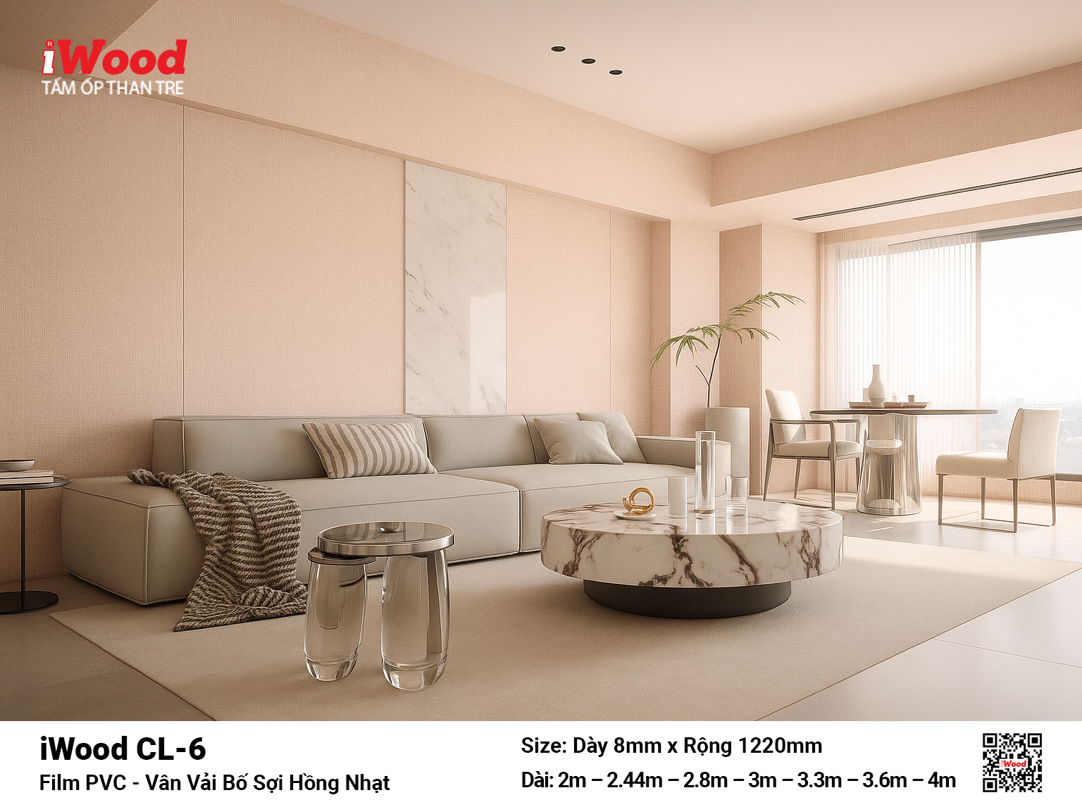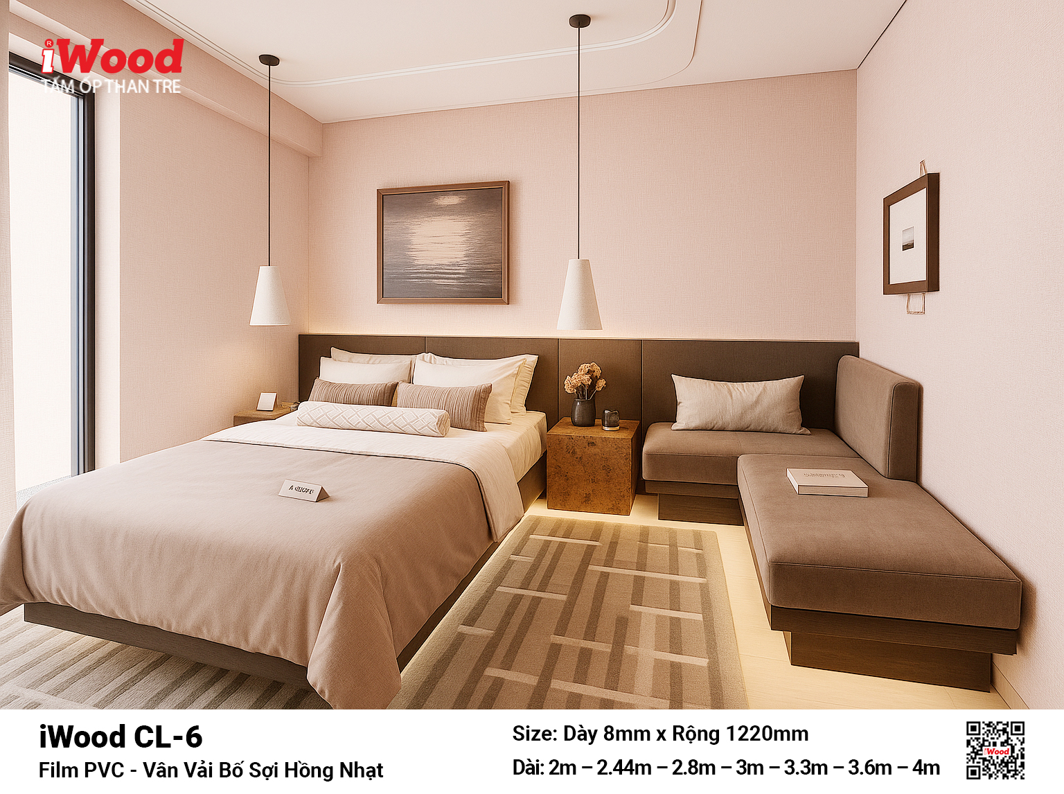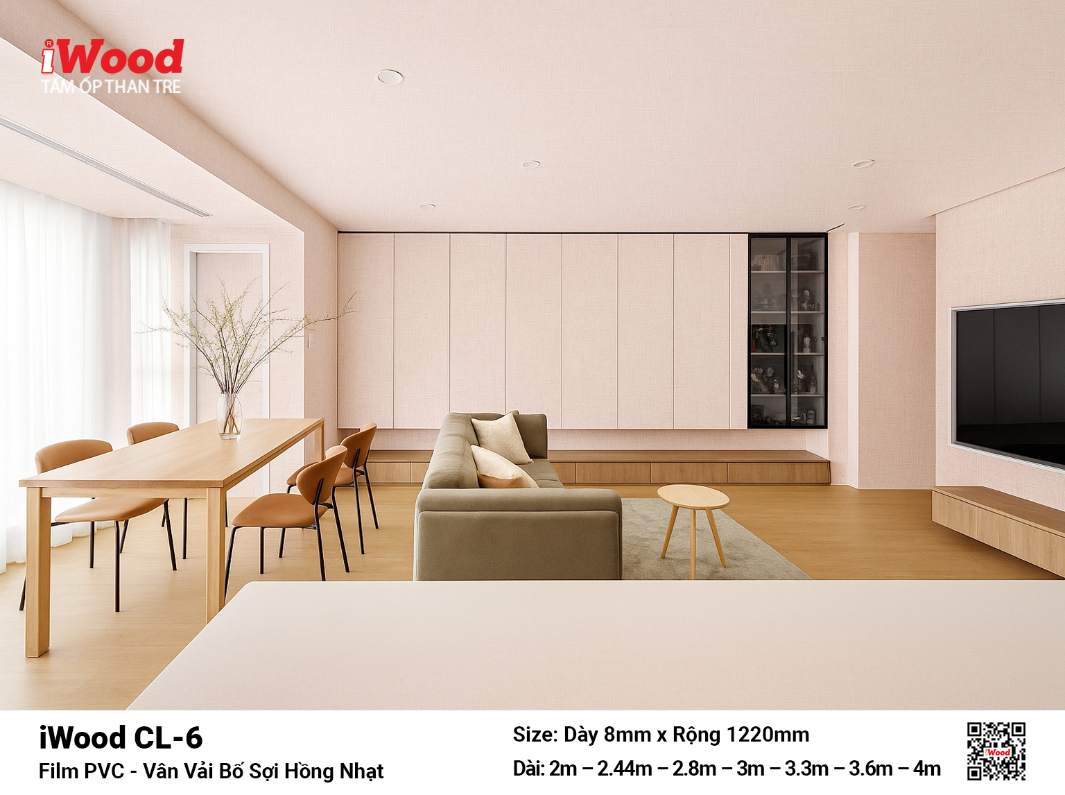 Tấm Than Tre Film Vân Vải Phối Cảnh 3DTấm Than Tre Film Vân Vải CL-6 Tấm ốp than tre CL-6 vân vải bố sợi hồng nhạt mang đến không gian ấm áp, nữ tính và tinh tế. Bề mặt bố sợi hồng nhạt tạo hiệu ứng mềm mại, thanh lịch, giúp căn phòng trở nên sinh động mà vẫn dịu mắt.