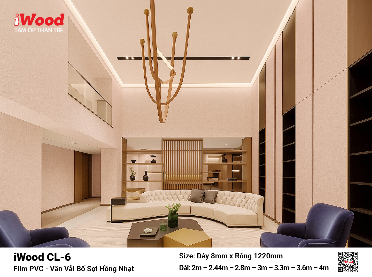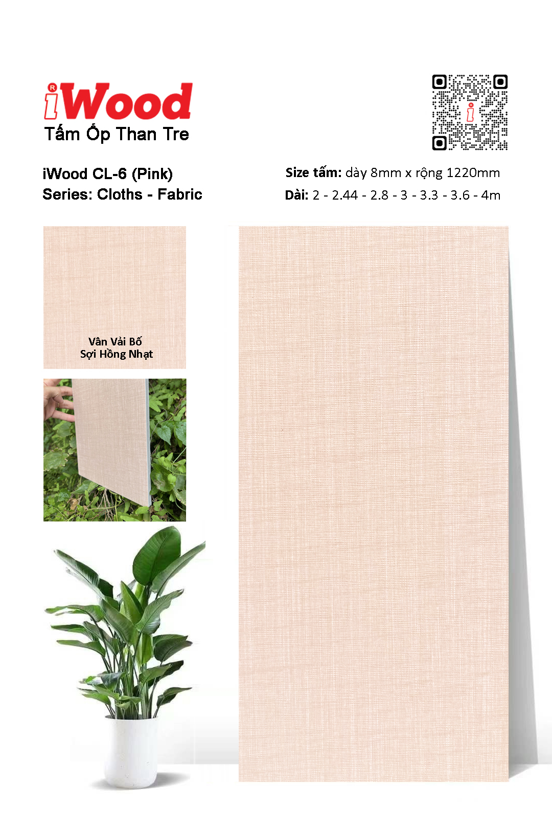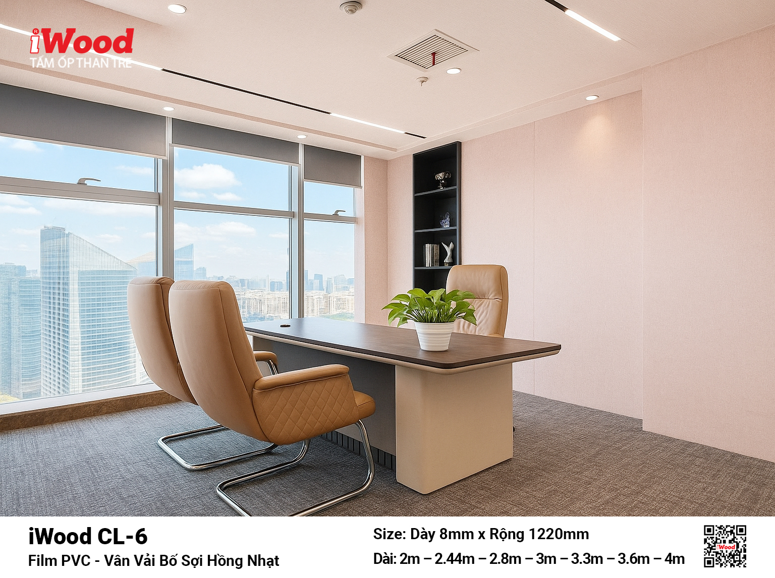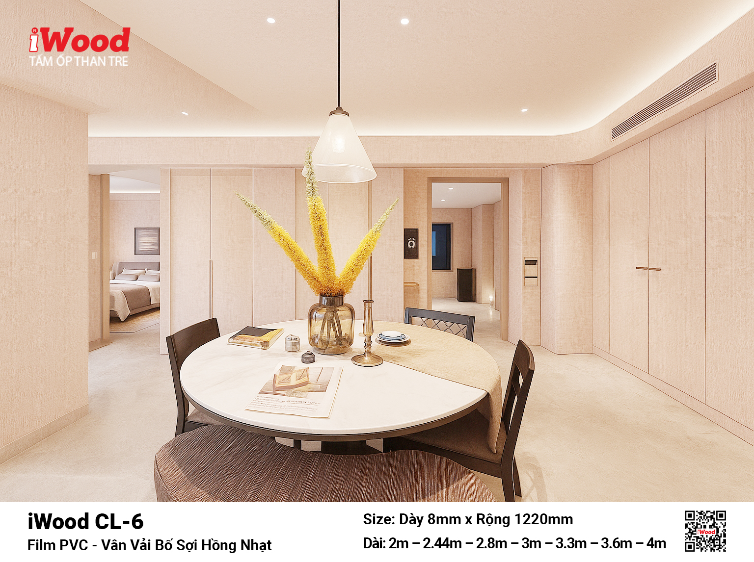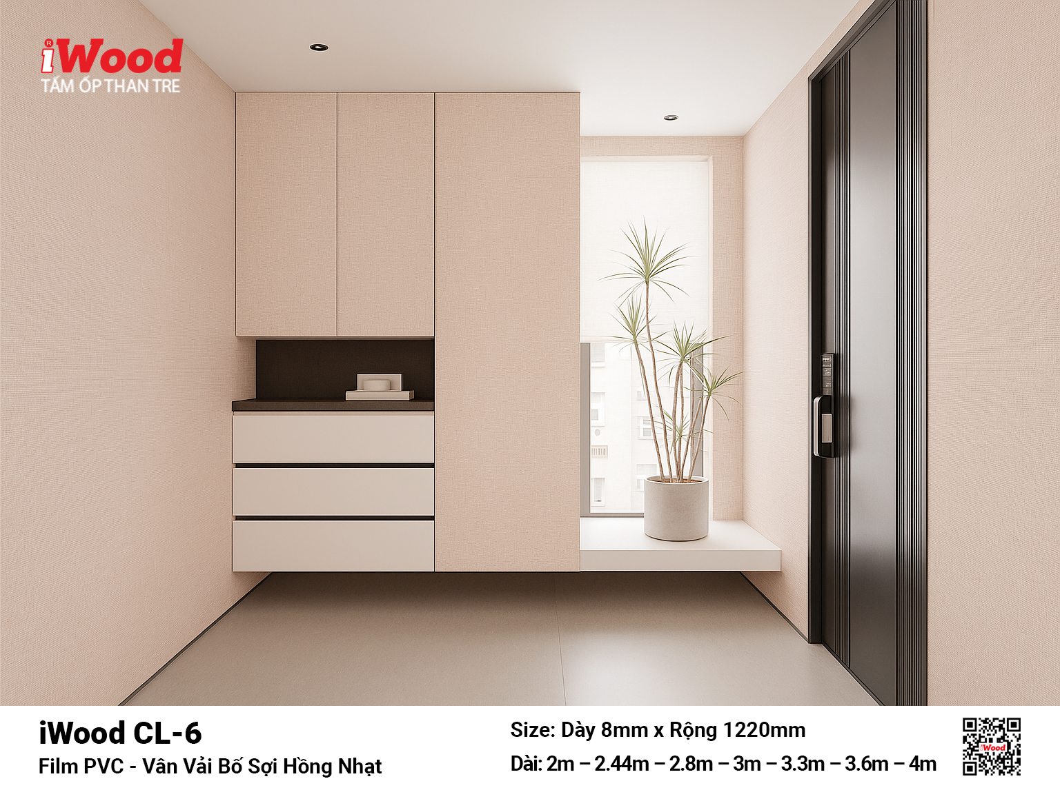 Tấm Than Tre Film Vân Vải Phối Cảnh 3DTấm Than Tre Film Vân Vải CL-6 Tấm ốp than tre CL-6 vân vải bố sợi hồng nhạt mang đến không gian ấm áp, nữ tính và tinh tế. Bề mặt bố sợi hồng nhạt tạo hiệu ứng mềm mại, thanh lịch, giúp căn phòng trở nên sinh động mà vẫn dịu mắt.