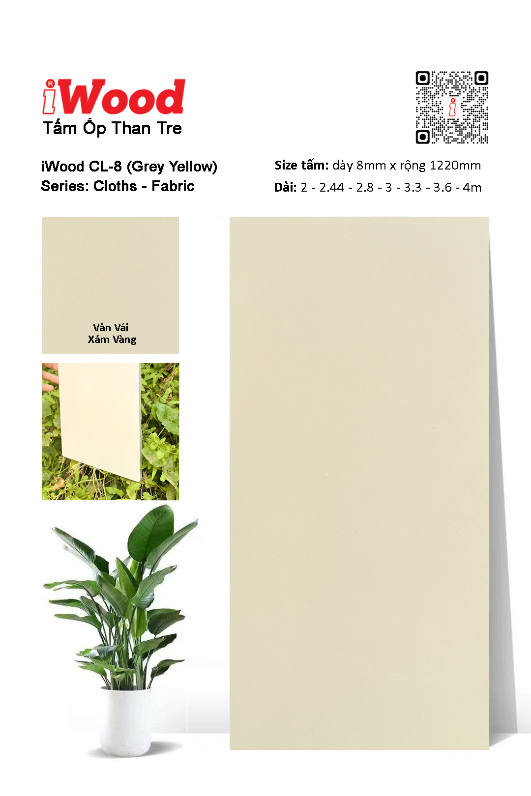 Tấm Than Tre Film Vân Vải Phối Cảnh 3DTấm Than Tre Film Vân Vải CL-8 Tấm ốp than tre CL-8 vân vải xám vàng mang đến không gian ấm áp, hiện đại và tinh tế. Màu xám vàng nhẹ nhàng kết hợp cùng bề mặt vân vải tạo chiều sâu, giúp căn phòng trở nên sang trọng, hài hòa và dễ phối hợp với các phong cách nội thất khác nhau.